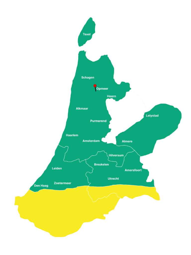 We plaatsen dakkapellen in een groot deel van Noord-Holland, Flevoland en Utrecht. Op de kaart hierboven ziet u precies in welke regio’s we actief zijn. Vanuit onze locatie in Opmeer werken we dagelijks in plaatsen zoals Alkmaar, Heerhugowaard, Hoorn, Purmerend, Amsterdam, Haarlem en Utrecht. Ook steden als Lelystad, Almere, Zoetermeer, Amersfoort, maar ook bijvoorbeeld Texel vallen binnen ons werkgebied.